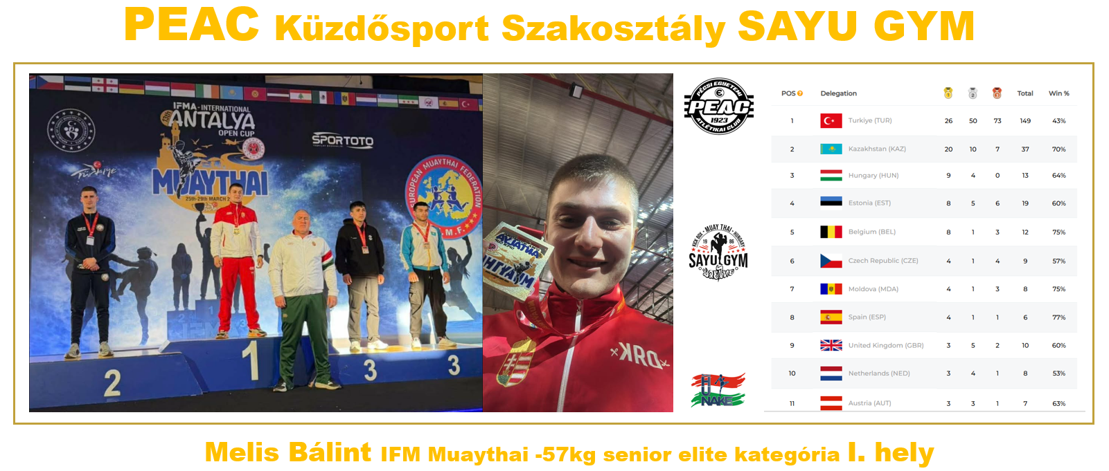 Köszönjük a PEAC támogatását, amely lehetővé tette a részvételt ezen a számunkra kiemelten fontos nemzetközi versenyen. Köszönet illeti továbbá a Küzdősport Szakosztály Sayu Gym edzőit és sportolóit a felkészülés során nyújtott munkájukért és támogatásukért.